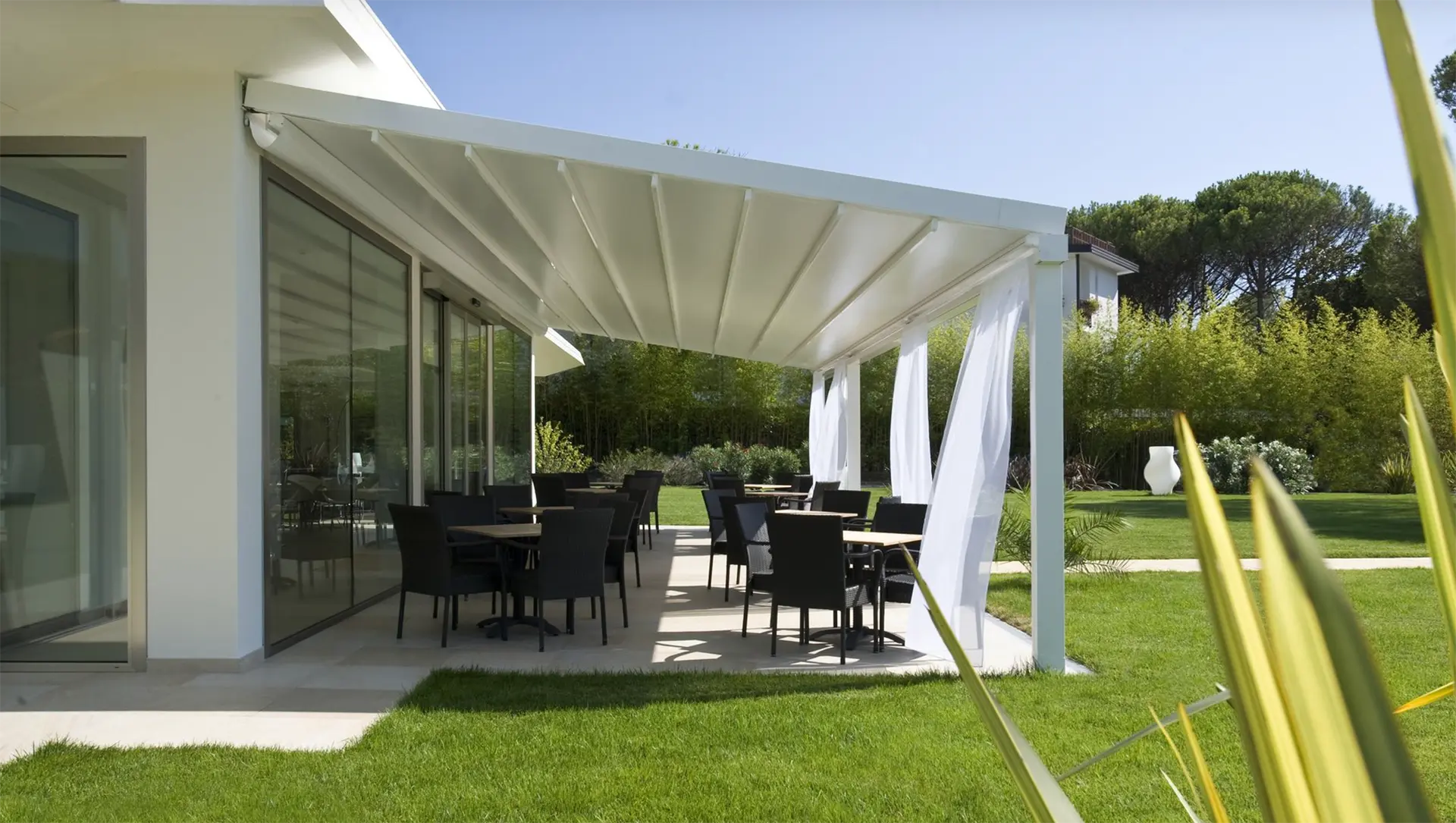 Dieses Terrassenfaltdach ist eine klassische, wandmontierte Pergola mit regensicherem Faltdach für zuverlässigen Sonnen- und Wetterschutz.