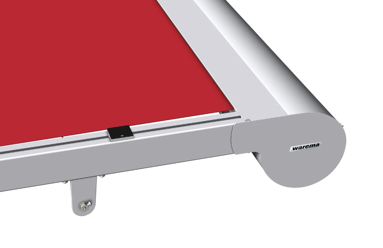 Detailansicht einer Warema Terrassenmarkise mit rotem Markisentuch